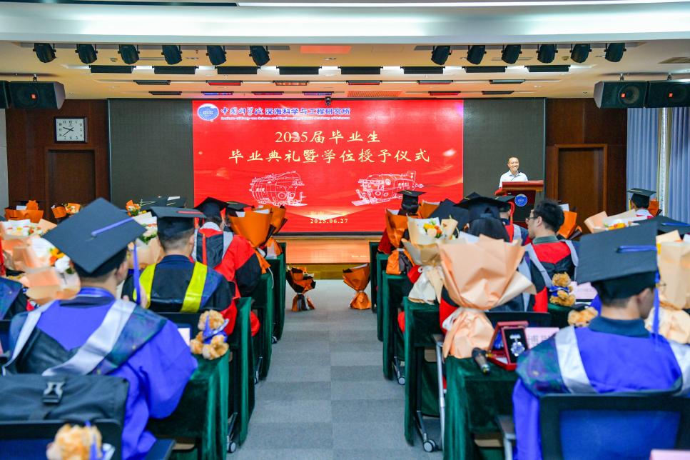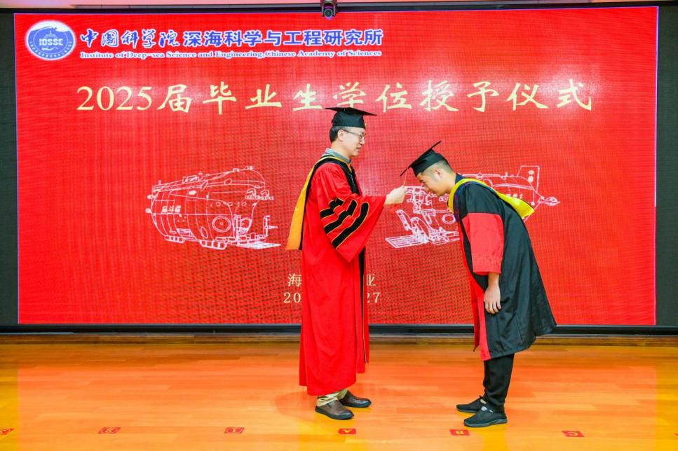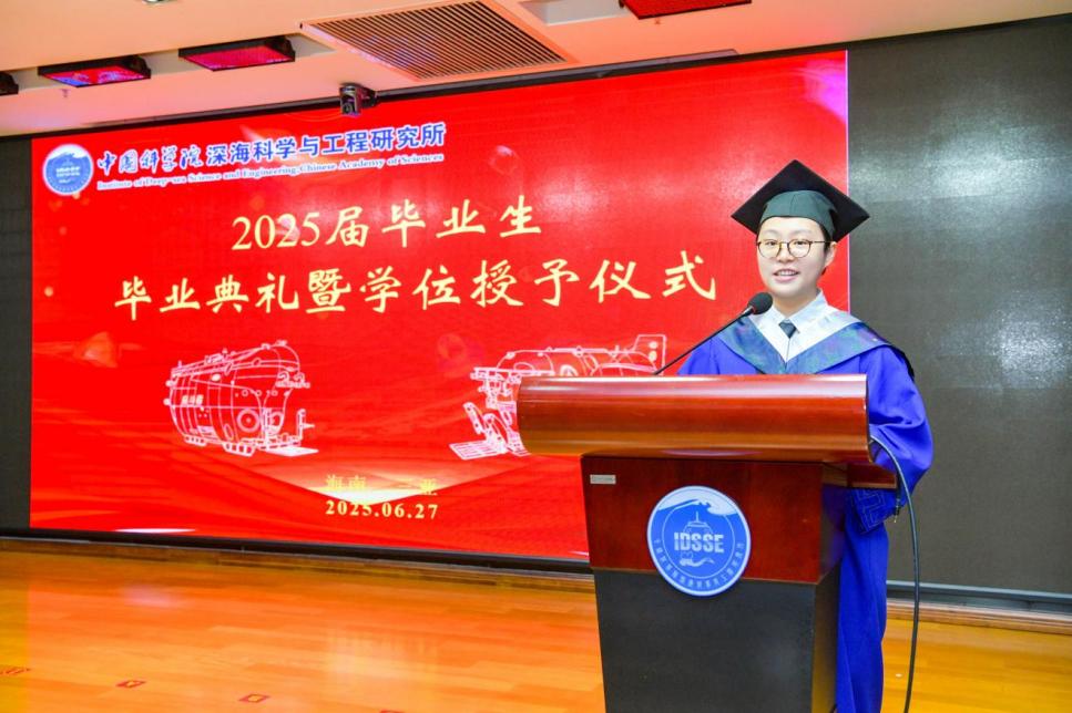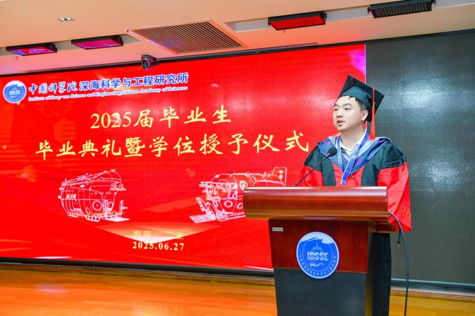 2025年6月27日, 中國科學院深??茖W與工程研究所(以下簡稱“深海所”)2025屆研究生畢業典禮暨2024-2025學年優秀學生表彰大會在1003會議室順利舉行。所領導、學位評定委員會委員、研究生導師及人事教育處老師齊聚一堂,共同歡送34名畢業生。會議由崖州灣園區管理部主任張忠主持。