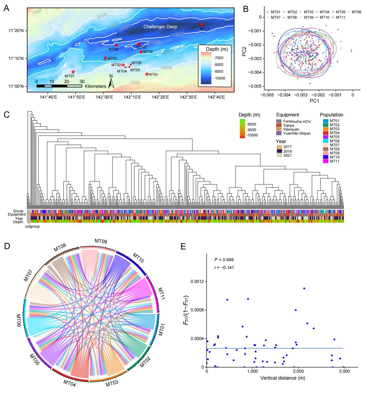 研究團隊對馬里亞納海溝的510只(11個群體)、雅浦海溝94只(1個群體)及西菲律賓海盆深淵區(qū)的18只(1個群體)H. gigas個體進行了高覆蓋的全基因組重測序和群體遺傳學(xué)分析。結(jié)果顯示來自馬里亞納海溝11個不同深度(~7000-11000米)群體不存在遺傳分化,表明生活在馬里亞納海溝內(nèi)的鉤蝦是一個完全混合的群體,高靜水壓不會限制其在海溝內(nèi)的垂直遷移。而西菲律賓海盆的鉤蝦群體與馬里亞納海溝的群體則表現(xiàn)出明顯的遺傳分化。這兩個海溝間相隔~1500公里,表明地理隔離阻礙了群體間的基因交流。