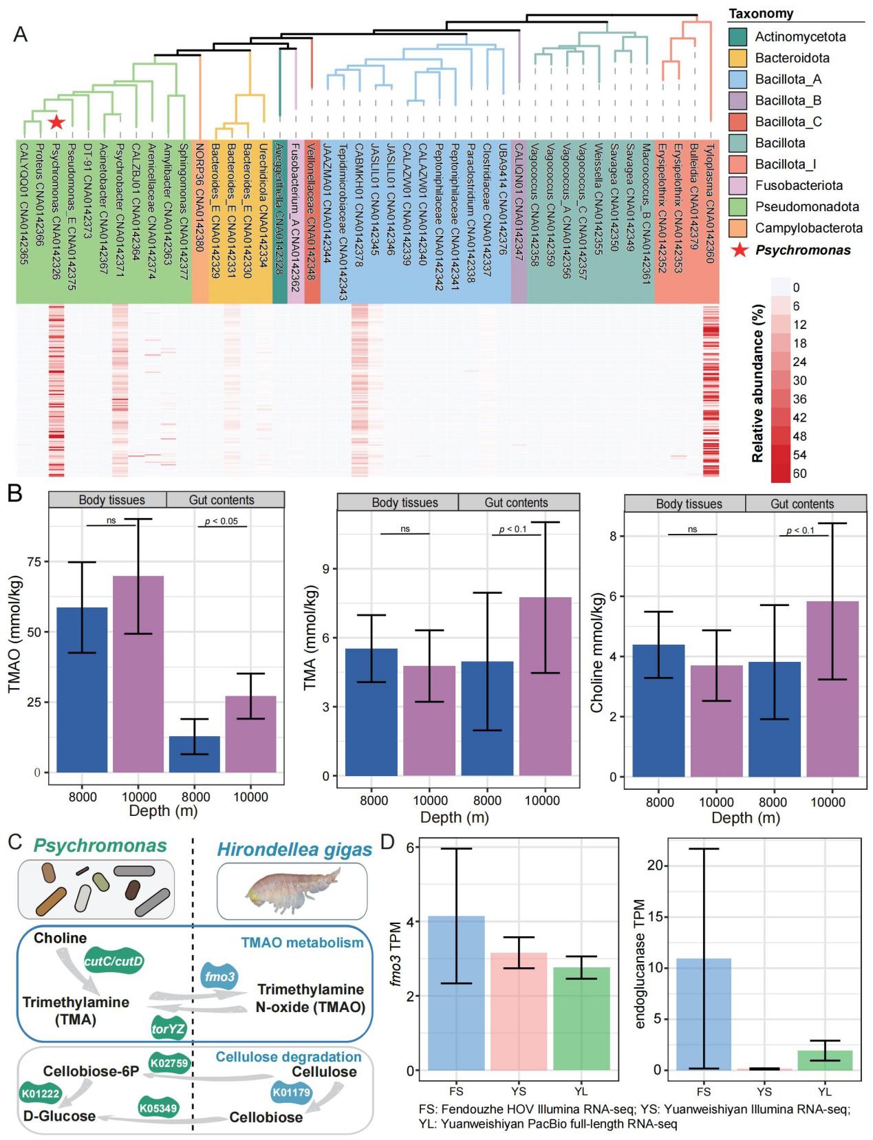 氧化三甲胺(TMAO)是一種滲透調(diào)節(jié)物質(zhì),在滲透壓調(diào)節(jié)以及在高靜水壓條件下維持細胞完整性方面發(fā)揮著重要作用。檢測發(fā)現(xiàn),隨著深度增加,鉤蝦腸道內(nèi)容物中TMAO濃度顯著升高,體組織中也呈現(xiàn)類似趨勢。鉤蝦自身編碼fmo3基因,可將三甲胺(TMA)轉(zhuǎn)化為TMAO。而其優(yōu)勢共生菌Psychomonas的基因組中攜帶cutC和cutD基因簇,可將膽堿分解為TMA;同時擁有torYZ操縱子,可以將TMAO還原為TMA,從而調(diào)控宿主體內(nèi)的TMAO濃度,形成動態(tài)平衡。