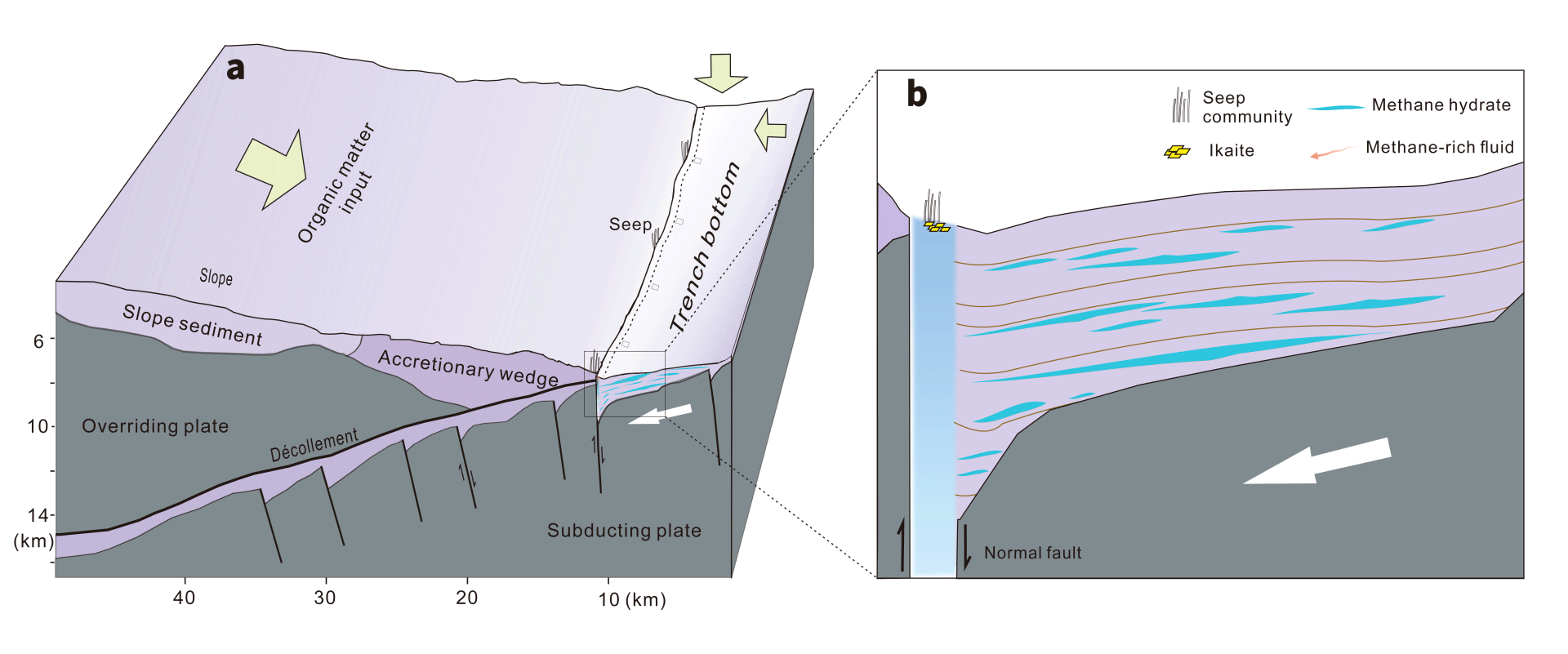 該研究對理解地球深部碳循環具有深遠意義。通過地球化學分析,研究人員發現這些環境中的甲烷實際上是由沉積層深處的微生物活動產生的。這一結果表明,在深淵海底之下還存在著一個前所未知的、龐大活躍的深部生物圏,不斷將由沉降有機質分解而來的二氧化碳轉化為甲烷。因此,這一過程可能封存了大量的從上層海洋沉降的有機碳,并以天然氣水合物等形式在深淵海底形成規模巨大的甲烷儲庫,挑戰了傳統的深海碳循環和碳收支模式。